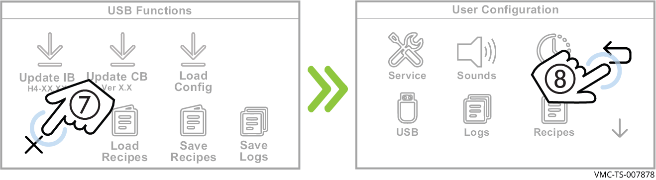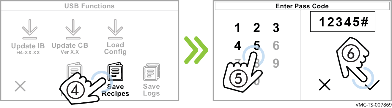 Touch Save Recipes ④. The Enter Pass Code screen displays. Enter the pass code 12345 ⑤. Touch the check mark ⑥.