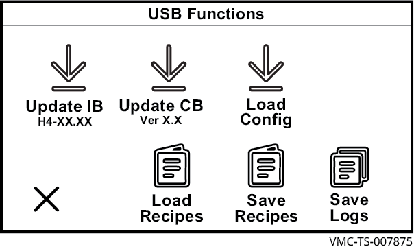 The Saving Recipes screen displays during the saving process. When the process is complete, the USB Functions screen displays.
