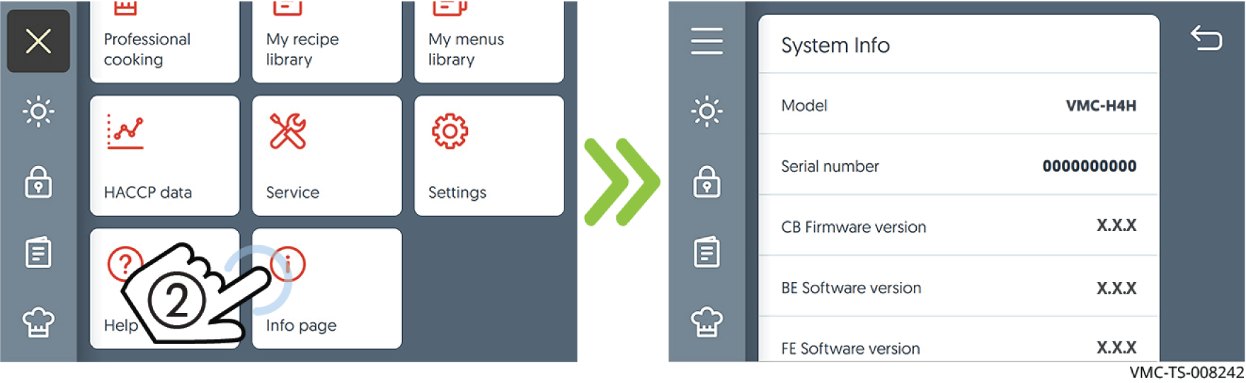 The oven information screen shows the system info, serial number, network status, and connection settings.